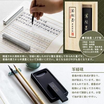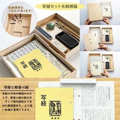 セット内容:墨、筆2本、硯、文鎮、水滴、筆置き、写経用紙、下敷き、桐製硯箱、教書本
