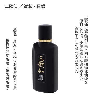 この三歌仙は高級固形墨と同じ純植物性油煙を原料として、小筆に適した書きやすい液体墨として開発しました。多くの先生方のご意見をお聞きして、用途や目的を3種に分類し、それぞれに適した濃さに調合致しました。コクのある書き味、厚み、深みのある紫紺系の色調をお楽しみください。